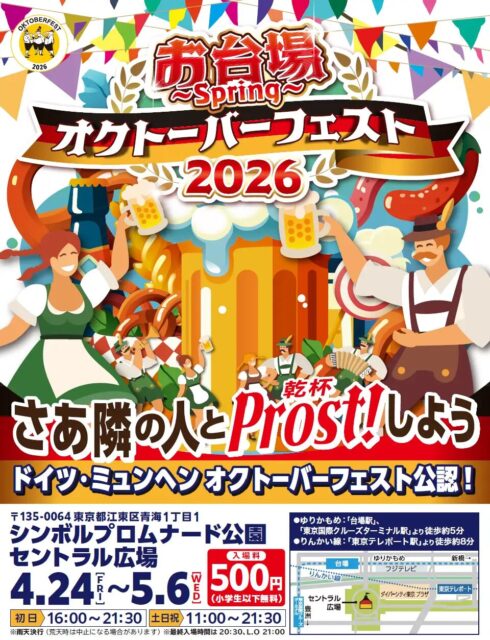 ゴールデンウィークの東京・お台場に、本場ドイツ・ミュンヘンの空気を体感できる大型イベントが帰ってくる。2026年4月24日(金)から開催される「オクトーバーフェスト2026 inお台場 ~Spring~」は、“没入感”をテーマに、来場者同士が自然に交流できるリアル体験型の空間を打ち出す。