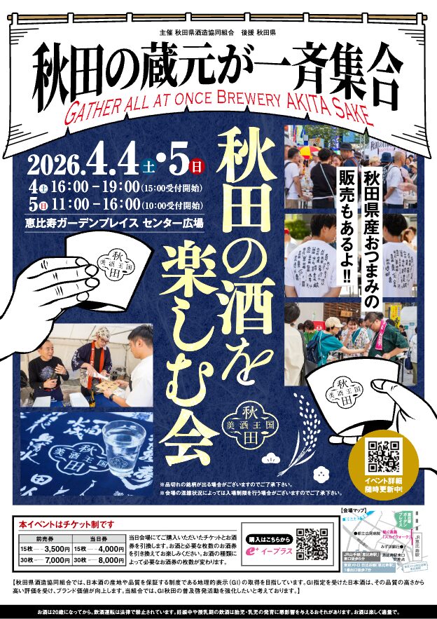 秋田の酒を楽しむ会in東京|4月4日(土)・5日(日)恵比寿ガーデンプレイスで秋田の酒蔵が集結する日本酒イベント